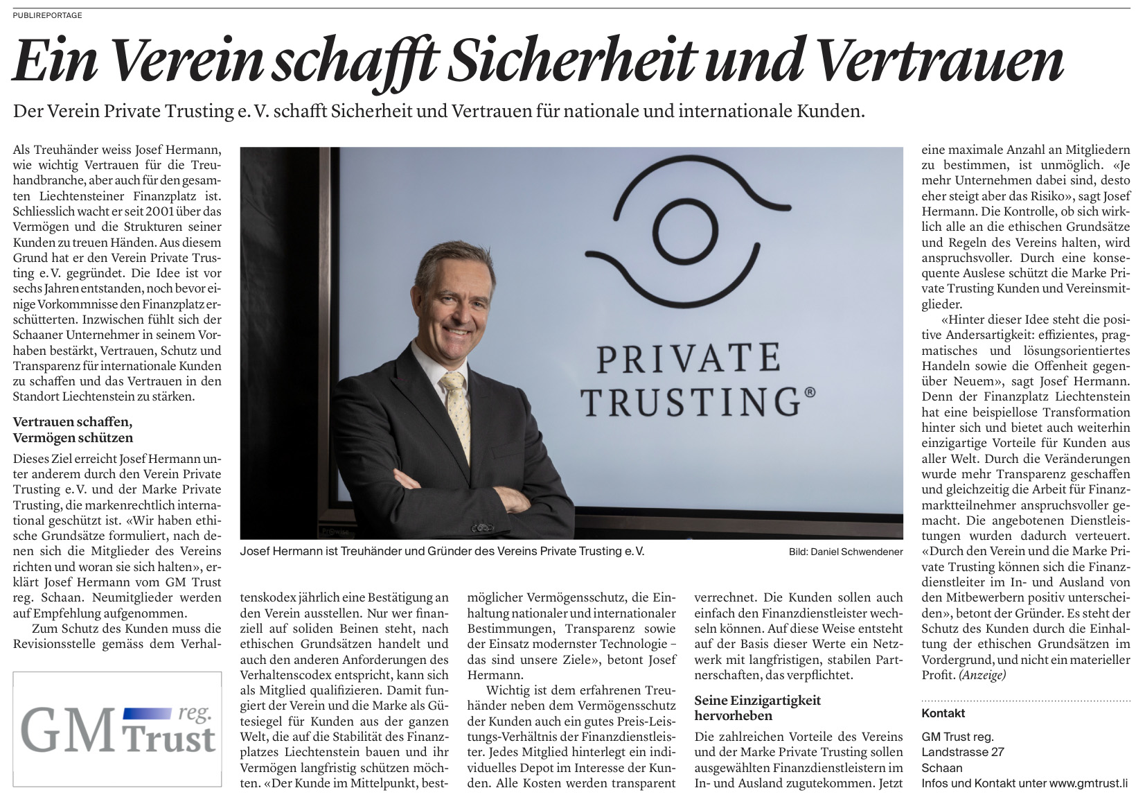 Als Treuhänder weiss Josef Hermann, wie wichtig Vertrauen für die Treu­handbranche, aber auch für den gesam­ten Liechtensteiner Finanzplatz ist. Schliesslich wacht er seit 2001 über das Vermögen und die Strukturen seiner Kunden zu treuen Händen. Aus diesem Grund hat er den Verein Private Trus­ting e. V. gegründet. Die Idee ist vor sechs Jahren entstanden, noch bevor ei­nige Vorkommnisse den Finanzplatz er­schütterten. Inzwischen fühlt sich der Schaaner Unternehmer in seinem Vor­haben bestärkt, Vertrauen, Schutz und Transparenz für internationale Kunden zu schaffen und das Vertrauen in den Standort Liechtenstein zu stärken. Mehr…